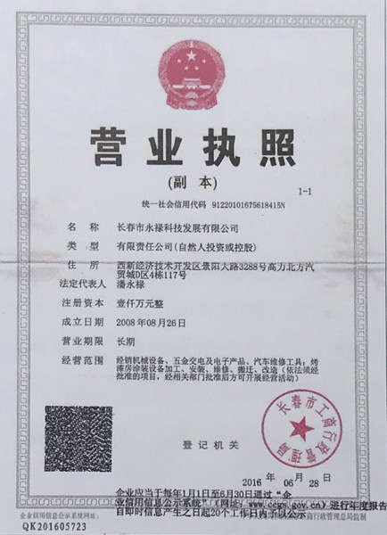证书名称: 长春永禄环保处理设备营业执照