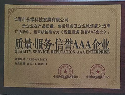 证书编号: 06 证书名称: 质量服务信誉AAA企业 发证机构: 中国企业发展促进委员会 生效日期: 2018年01月01日 截止日期: 2019年12月31日 认证简介: 长春市永禄科技发展有限公司,主营:废气光氧处理设备、环保喷涂设备、粉尘处理设备、污水处理设备,焊烟除尘设备、催化燃烧净化设备